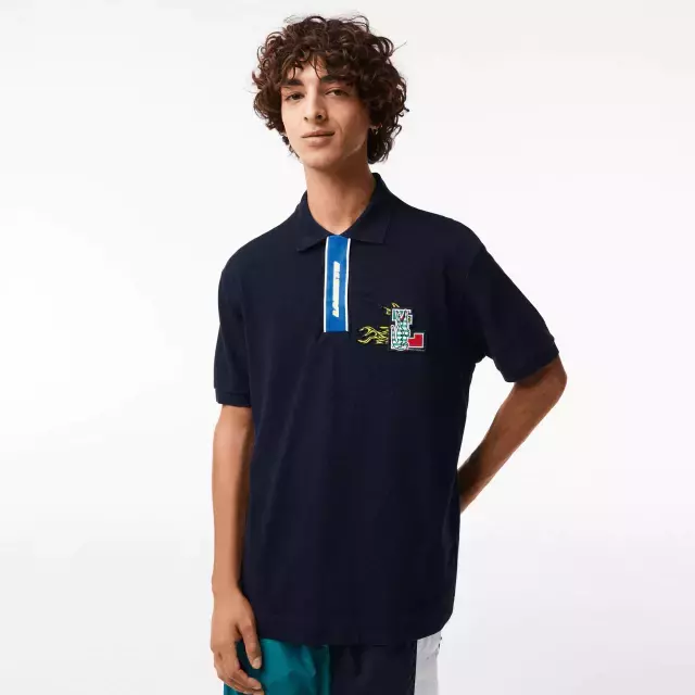 Responsável. Gráfico. Fabricado na França. Uma icônica camisa polo Lacoste adornada com um patch de crocodilo, inspirada nas passarelas da Lacoste.